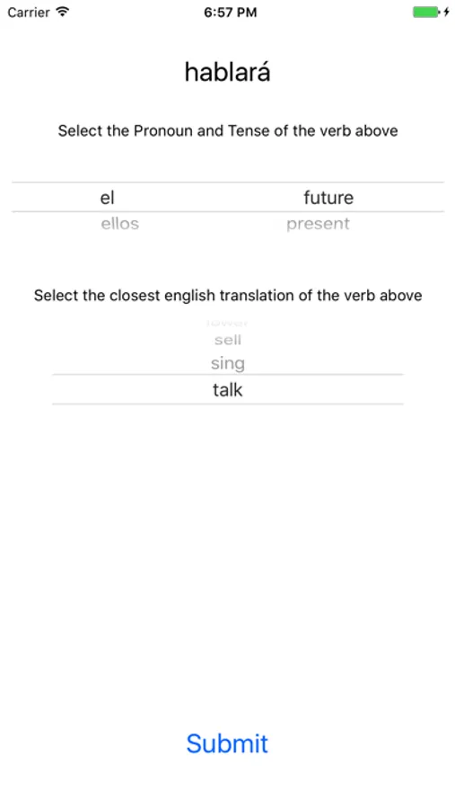 You can use this as a reference tool, looking up the conjugations for any of the verbs. You can also use it as a learning tool, drilling yourself on any combination of tenses and pronouns. The options menu allows you to set tenses, pronouns, vocabulary difficulty, and translation direction.