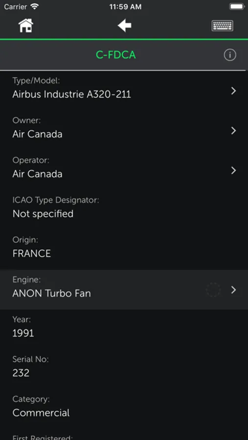 • For any of the above, make a single-tap call to the internet search engines, to discover anything known about the aircraft, owner, operator, or model etc.