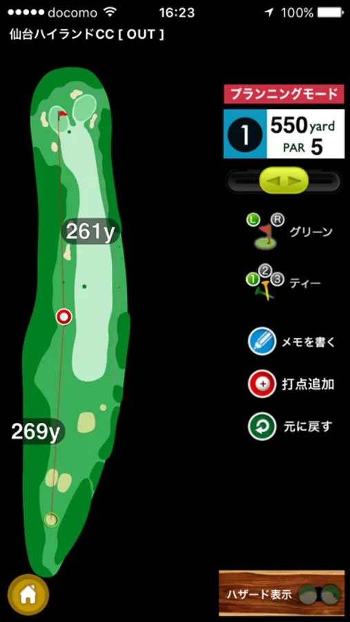 グリーン奥・手前のエッジ迄の距離やバンカー、池等のハザード迄の残り距離を表示します。
