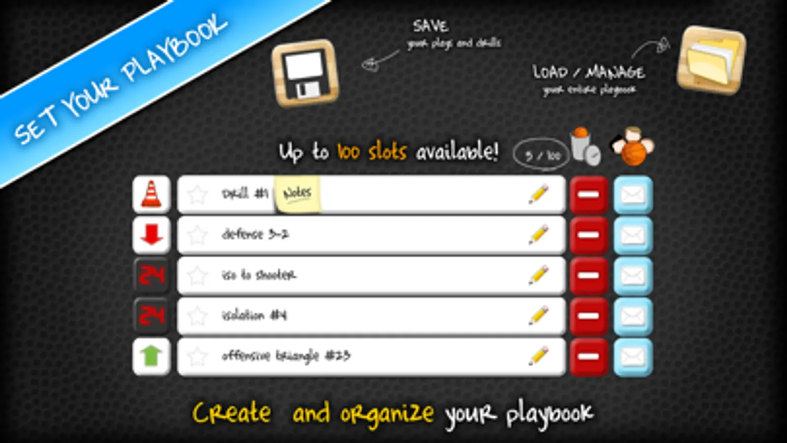 - Save up to 100 plays and organize them by type (offensive, defensive, clutch time, inbounds pass, fast break, jump ball, drill, etc.)