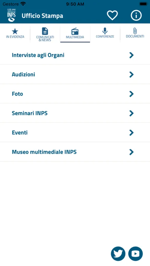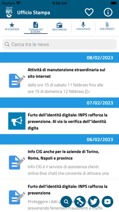 Nella sezione Comunicati e News sono disponibili gli ultimi 10 Comunicati e le ultime 10 news pubblicate nel portale. Inoltre dall’icona della cartina dell’Italia (in basso) è possibile accedere alle News dal territorio, per vedere le notizie pubblicate dalle Direzioni regionali e di coordinamento metropolitano INPS, con notifica mail istantanea ai giornalisti della stampa locale accreditati dalle strutture territoriali o agli utenti che si accreditano tramite l’apposita funzione dell’App.
