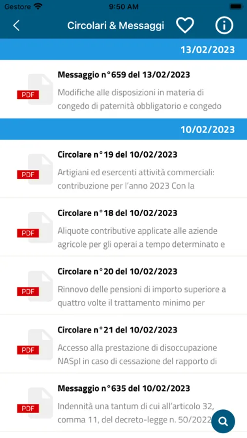 - un pulsante accanto a l’ultimo Messaggio e all’ultima Circolare per visualizzare la lista e aprire il dettaglio degli ultimi 10 messaggi e alle ultime 10 circolari pubblicati nel portale INPS;