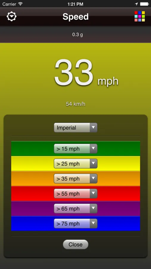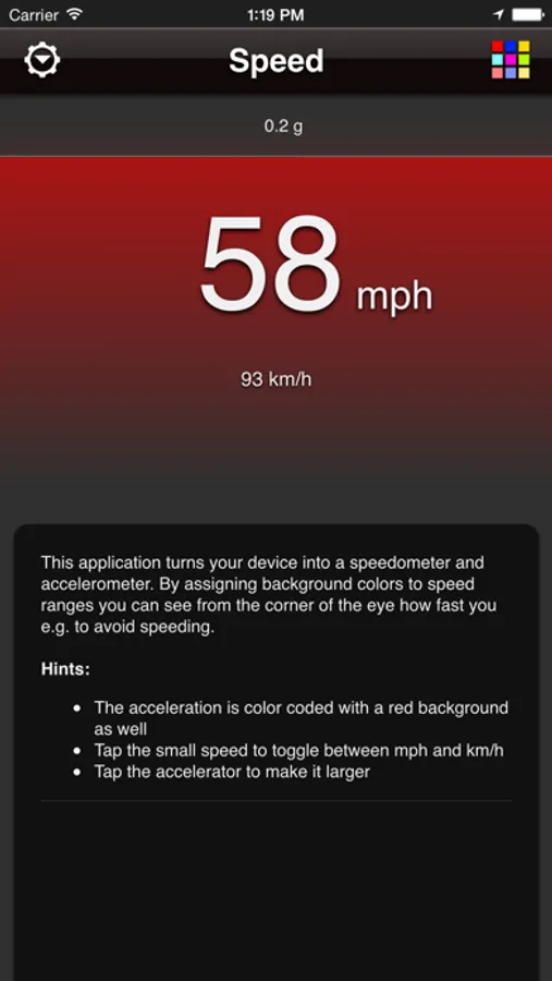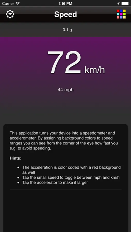This application turns your device into a speedometer and accelerometer. By assigning background colors to speed ranges you can see from the corner of the eye how fast you e.g. to avoid speeding.