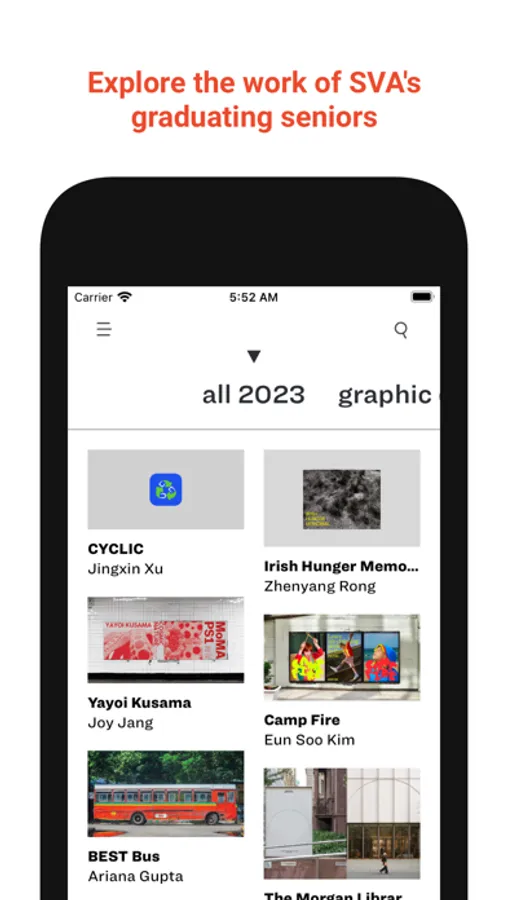 Explore the portfolios of the 2023 graduating class of the School of Visual Arts Advertising and Design Departments. Featuring graphic design, advertising, motion graphics, interactive design, and 3D design portfolios by our graduating seniors, this app gives you the opportunity to find and contact the most talented young designers for your company, startup, or project.
