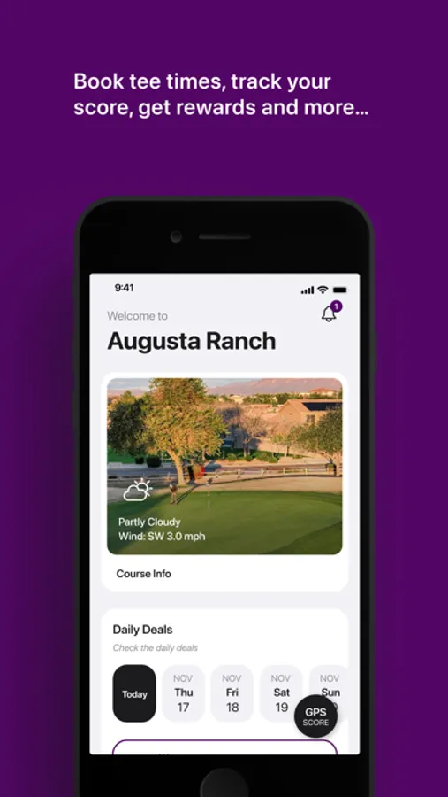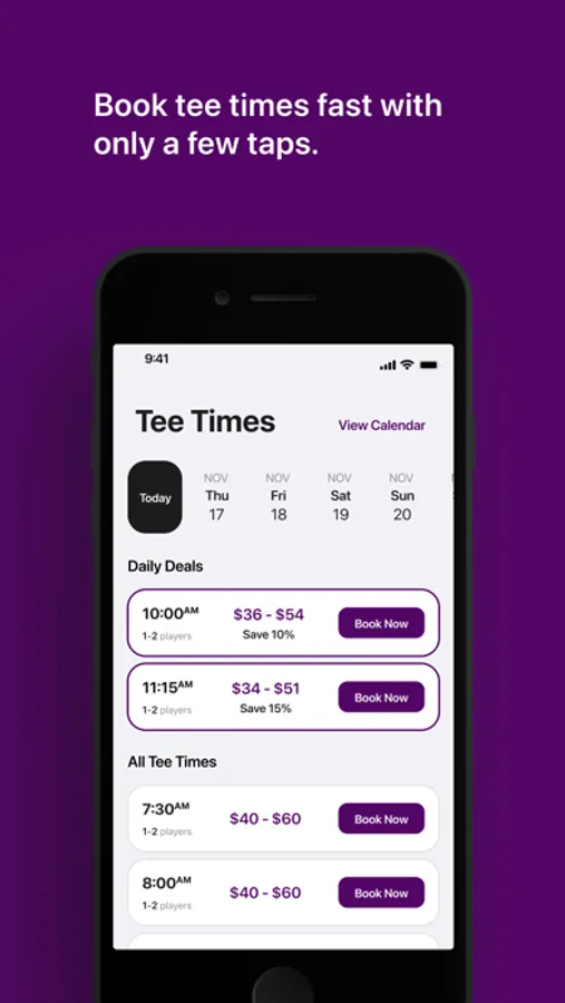 Booking a tee time is as easy as 3-taps and once you've setup your account the app will remember you so its always 3-taps. You can always look up your reservations and cancel reservations if you need to as well. Plus view and redeem your rewards or promotion codes anytime.