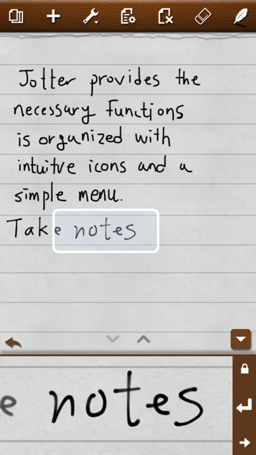 Jotter is like a notebook. You can easily write something quickly or draw a simple diagram with Jotter conveniently. Instead of a notebook, you can use Jotter to write or draw your idea in a quick, easy and convenient way. Jotter is acting like a real notebook. The size of you device is the size of your notebook, which will rotate automatically as you rotate the device, so what you see is what you get. If you want to use it in portrait mode, you can lay the device lengthwise. If you want to use it in landscape mode, you can lay your device widthwise.