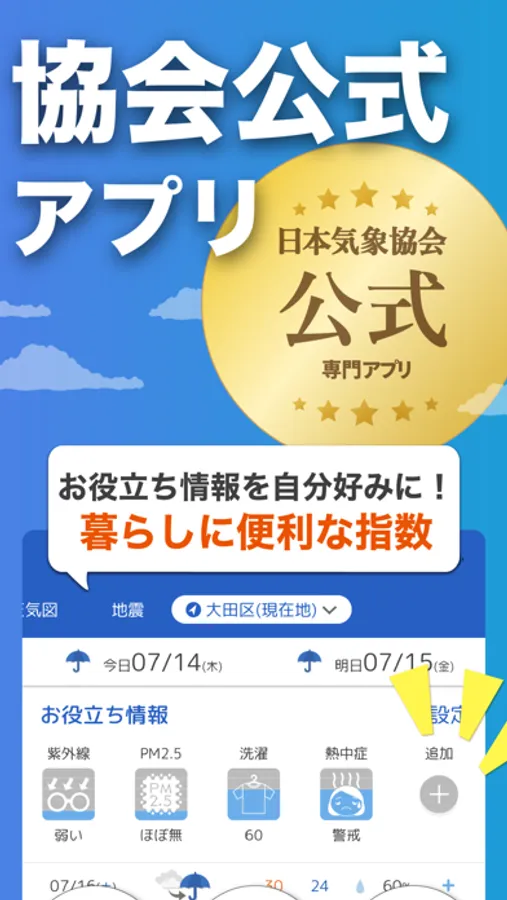 ・服装、風邪ひき、熱中症などのお役立ち生活指数を、アイコンからワンタップで確認。
