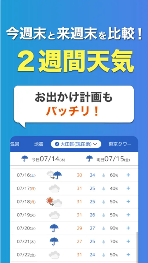 ・テレビ等でお馴染みの週間予報より長い14日間分の予報を確認できます。