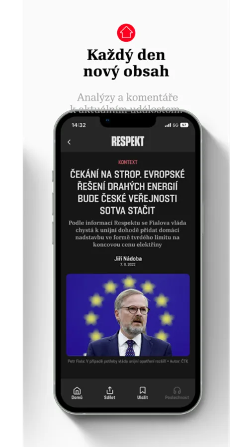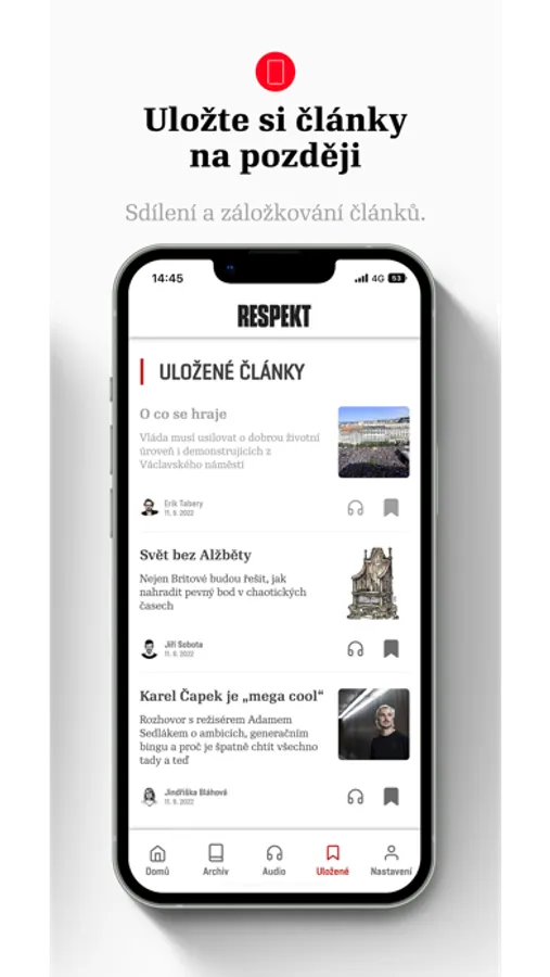 • Články můžete sdílet, jak jste ve svém zařízení zvyklí. Také si je můžete ukládat do záložek, které jsou synchronizované s vašimi uloženými články na webu Respektu.