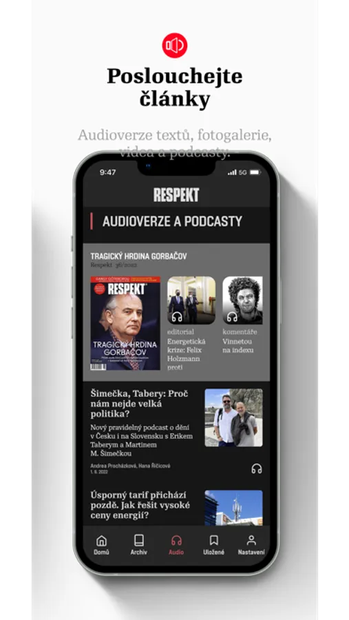 • Můžete také poslouchat audioverze vybraných textů a podcasty.