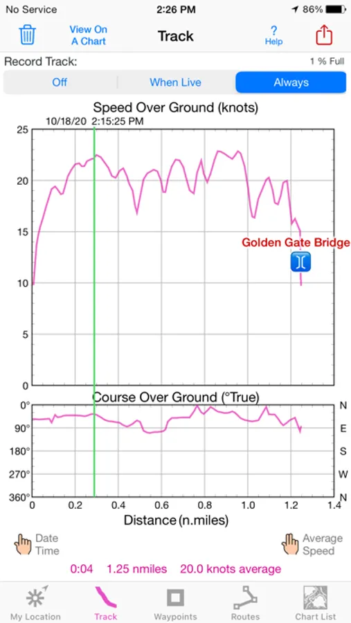 Record tracks as you sail, even in the background. View them on the chart and in a Speed & Course Over Ground graph.
