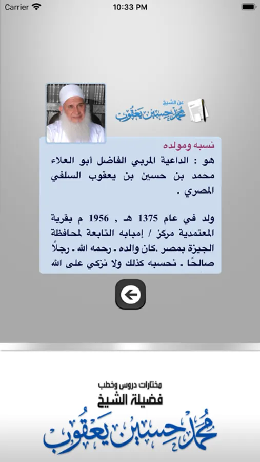 * التطبيق يحتوي على سيرة ذاتية للتعريف بالشيخ وتاريخه الدعوي