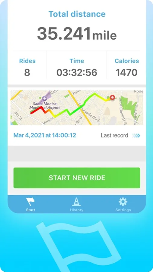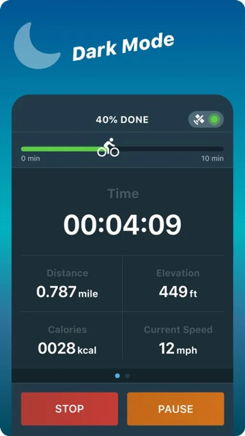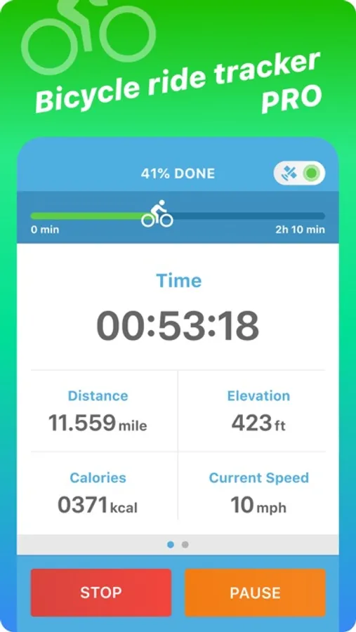 Bicycle ride tracker PRO automatically records your time, distance, speed, elevation, calories burned and location.
