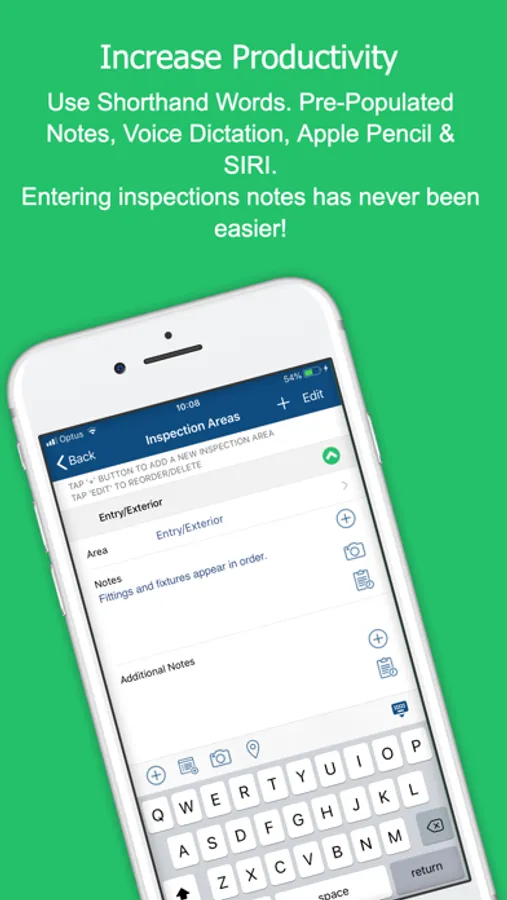 - Use Shorthand Words, Pre-Populated Notes, Voice Dictation (SIRI) or Apple Pencil to populate your Inspection Notes.