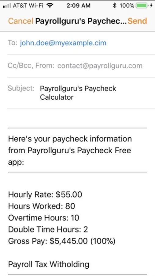 Paycheck details can be emailed to employee, employer, payroll service provider, spouse or anyone else. Use Paycheck Lite to estimate your net paycheck amount and budget your spending accordingly.