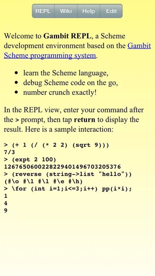 Gambit REPL is a compact development environment for the Scheme programming language based on the Gambit Scheme programming system. Use it on iPhone, iPod touch and iPad devices to learn the Scheme programming language. Hack scripts on the go!