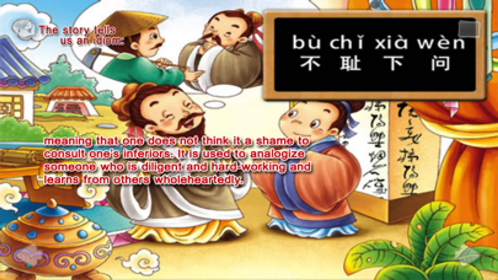 This story is one of the many life stories a child needs to learn. It tells us of the story“do not feel ashamed to ask and learn from one’s inferiors” which means that one does not think it a shame to consult one’s inferiors. It is used to analogize someone who is diligent and hard-working and learns from others wholeheartedly.