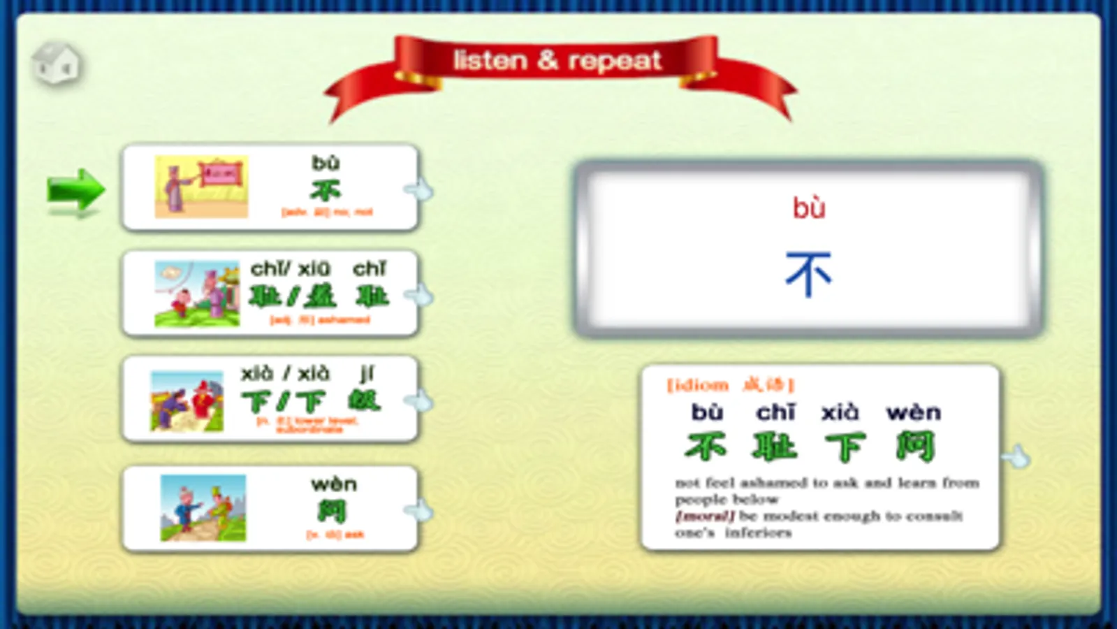 The application tells a vivid story from ancient China, it takes you into the wonder land of Chinese culture, language and wisdom. The morals and examples of these stories provide excellent role models for your children.