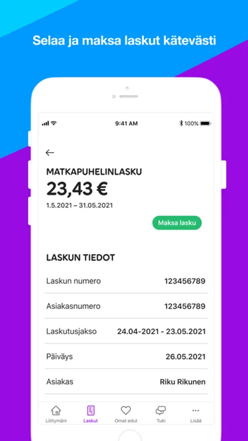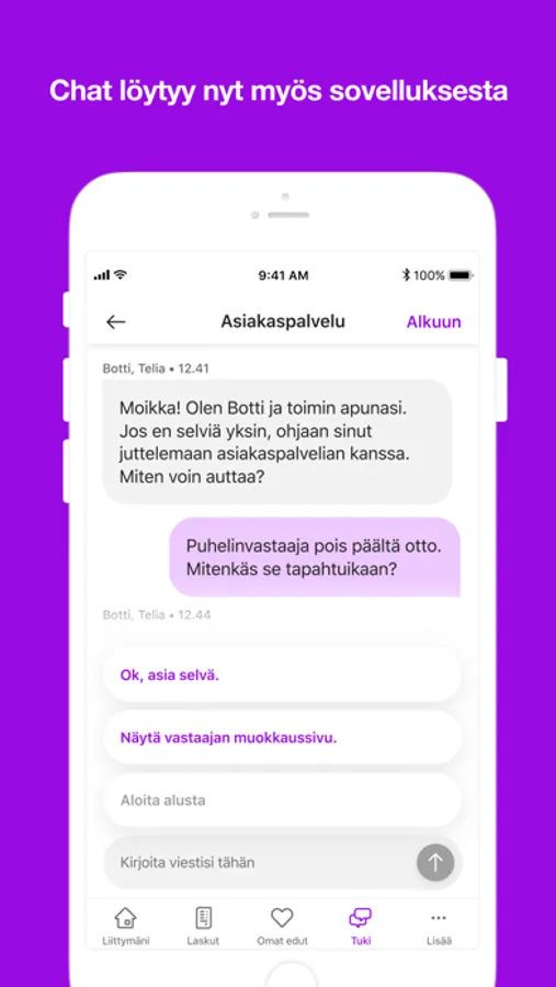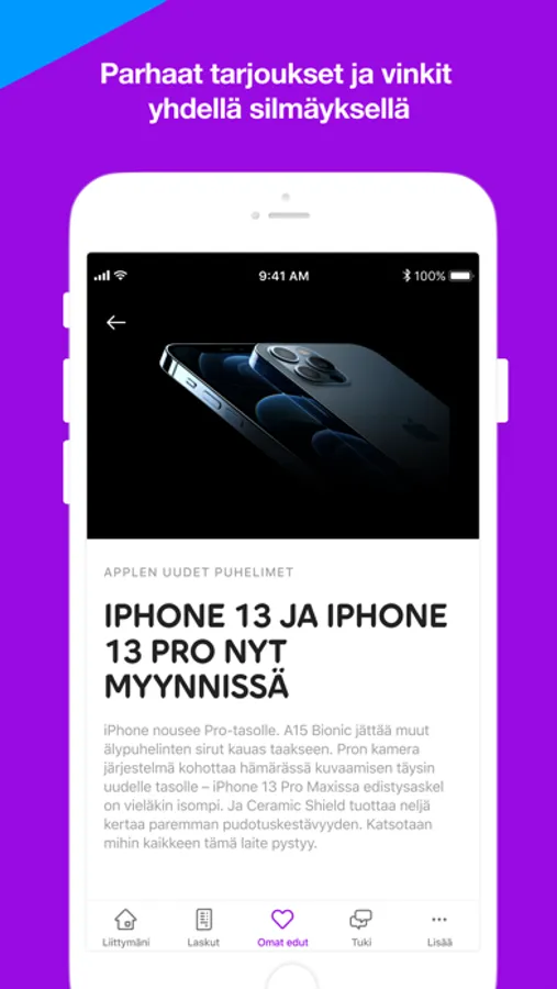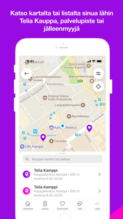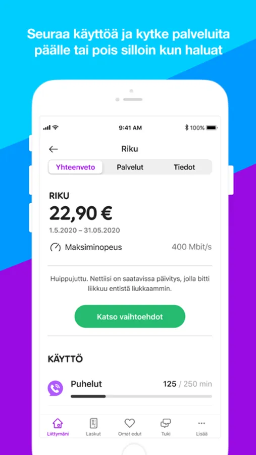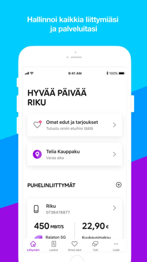 Luo yhteys Teliaan ja hallitse omia palveluitasi Minun Telia -sovelluksella missä ja milloin vain, kunhan luurissasi on virtaa. Voit kirjautua appiin Telian käyttäjätunnuksella sekä kätevästi mobiilivarmenteella. Kirjautuneena voit seurata liittymäsi saldon kertymistä, muokata palveluitasi ja maksaa laskusi pois.