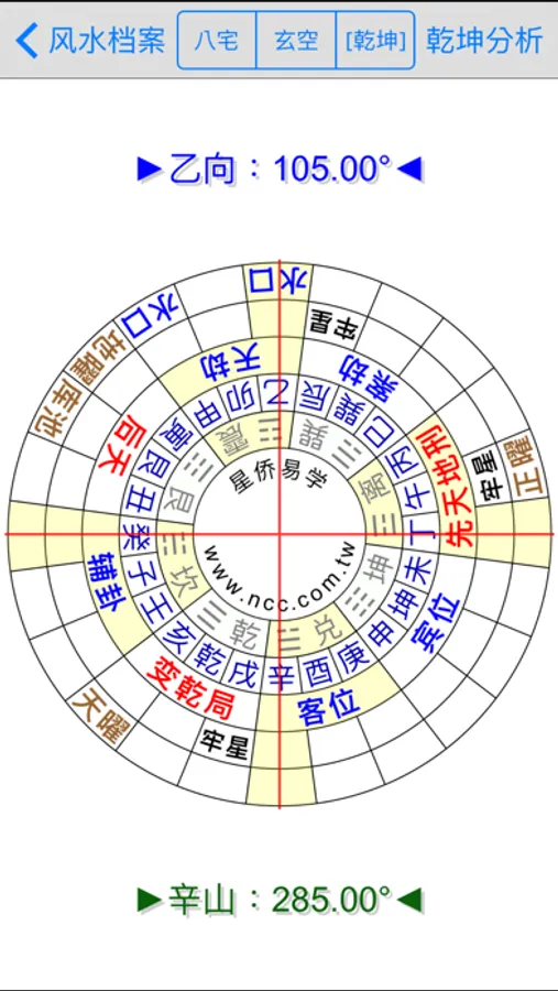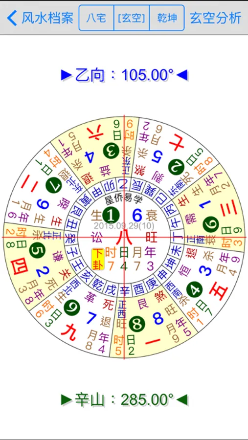●玄空圓盤:顯示元運、山星、向星、卦名、關煞、山星衰旺、向星衰旺、行運紫白(年月日時紫白飛星)、方位、下卦/起星、廿四山。