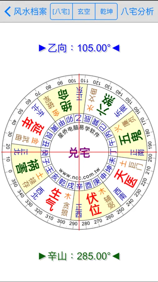 ●八宅圓盤:顯示方位、遊年、輔星、五行、廿四山、刻度角度。