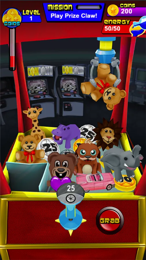 Step up to the machine and maneuver the claw to grab coins, gems, a stuffed animal, cars, dolls, and much more! This game is much more than the standard grabbing you get from arcade crane machines, however: Prize Claw is filled with all sorts of unique items, powerful effects and challenging missions. Special gems grant an effect to enhance your collection power, and you can trade the prizes you collect for extra special bonuses. Prizes aren't the only thing you can trade in: the coins you collect can be spent to upgrade your claw, activate new powers, and even customize your machine! If you run out of grabs, don't fret! It won't take long before you receive more. Keep checking back to complete your collection, increase your skill with the grabber, reach a higher level, and unlock more stuff!