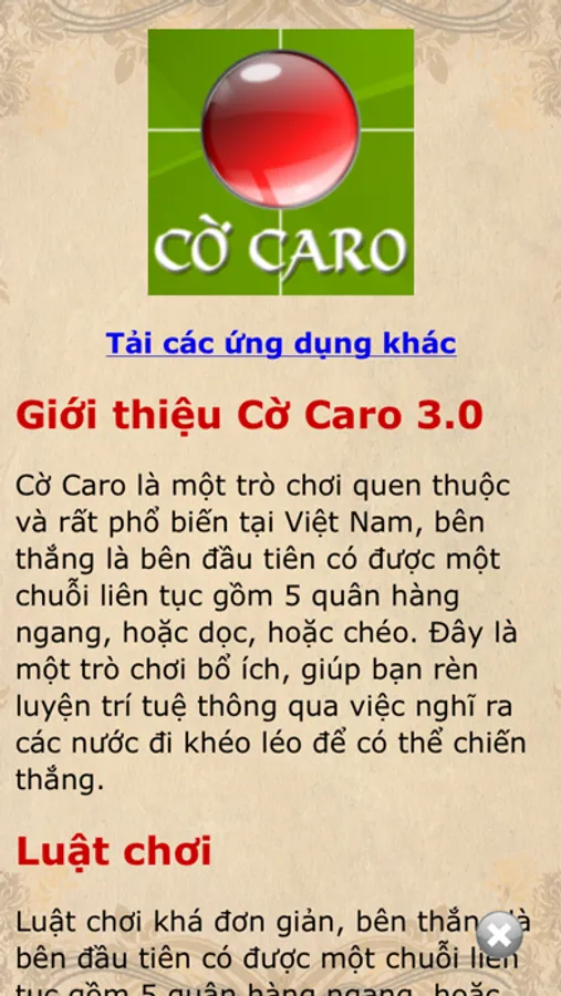 Cờ Caro là một trò chơi quen thuộc và rất phổ biến tại Việt Nam, hay được học sinh chơi trên giấy tập kẻ ca-rô nên được gọi là cờ Caro. Trong trò chơi này, bên thắng là bên đầu tiên có được một chuỗi liên tục gồm 5 quân hàng ngang, hoặc dọc, hoặc chéo. Đây là một trò chơi bổ ích, giúp bạn rèn luyện trí tuệ thông qua việc nghĩ ra các nước đi khéo léo để có thể chiến thắng.