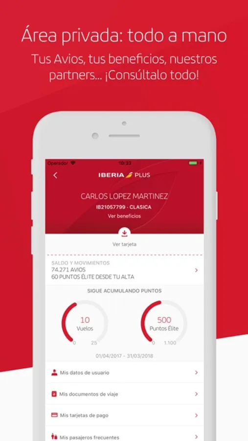 Sign up and manage your profile in your Private Area: travel documents, credit cards, frequent passengers ... Take your Iberia Plus cards on your mobile and view them comfortably. Check your accumulated Avios balance with us or our partners. Enjoy discounts and promotions in restaurants, technology, leisure ... This is our exclusive loyalty program.
