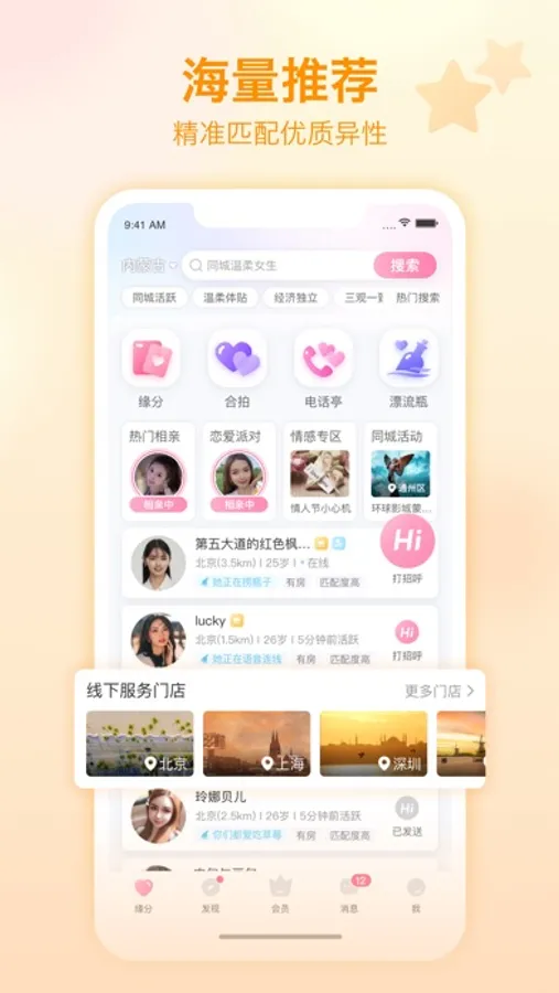 新增的缘分圈功能提供了一个很好的自我展示平台,让更多人可以深入的了解到你的生活状态,与你分享生活中的喜怒哀乐。通过缘分圈可以更快的建立彼此之间的了解与信任。相信你未来那个Ta就在其中。