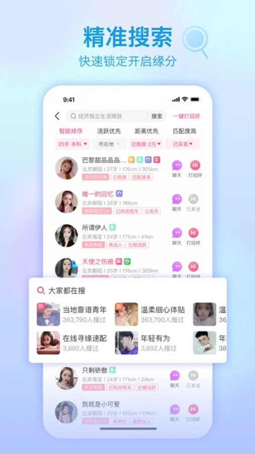 搜索——在线、新注册、距离近、同城老乡、星座速配…;只有想不到没有搜不到