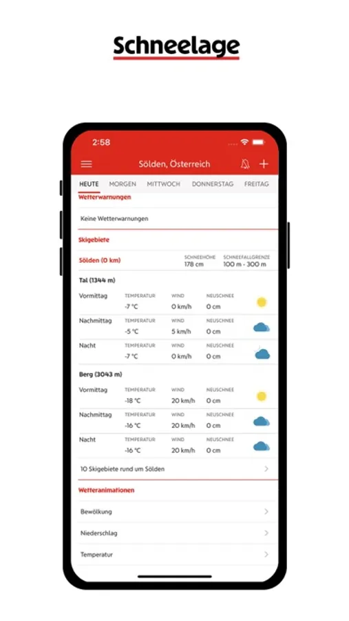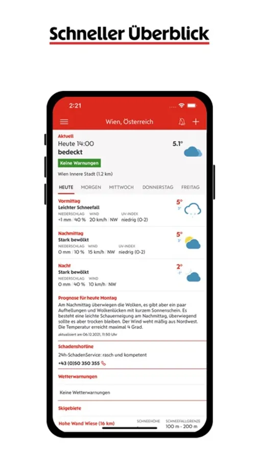 Die Wetter Plus-App der Wiener Städtischen und ZAMG (Zentralanstalt für Meteorologie und Geodynamik) bieten neue Funktionen für Sie. Neben dem modernen Design dürfen Sie sich über viele nützliche Funktionen freuen: Unwetterwarnung zu* jedem beliebigen Aufenthaltsort in Österreich und 5-Tages-Wetterprognosen für Ihr Reiseziel im Ausland.