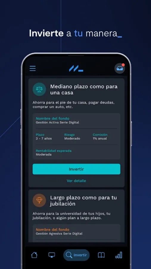 INVIERTE A TU MANERA. ¿Eres un inversionista experto, o estás recién empezando? Elige la forma de invertir con la que te sientas más a gusto. Puedes filtrar inversiones por clase de activo geografía o industria, revisa información detallada e invierte en pocos clicks. Si crees que es muy complicado, solo ponte un objetivo a corto, mediano o largo plazo y deja que nuestros expertos se encarguen de manejar tu inversión.
