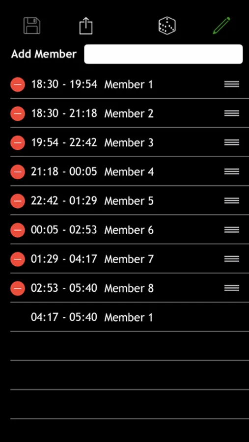 You can add and remove members from the list on the fly, even switch their positions and watch the times recalculate for you!