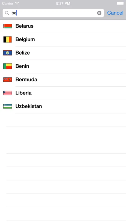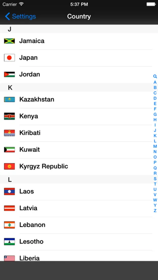 Search by index or free search to quickly select the country. Each country is listed by its name and national flag.