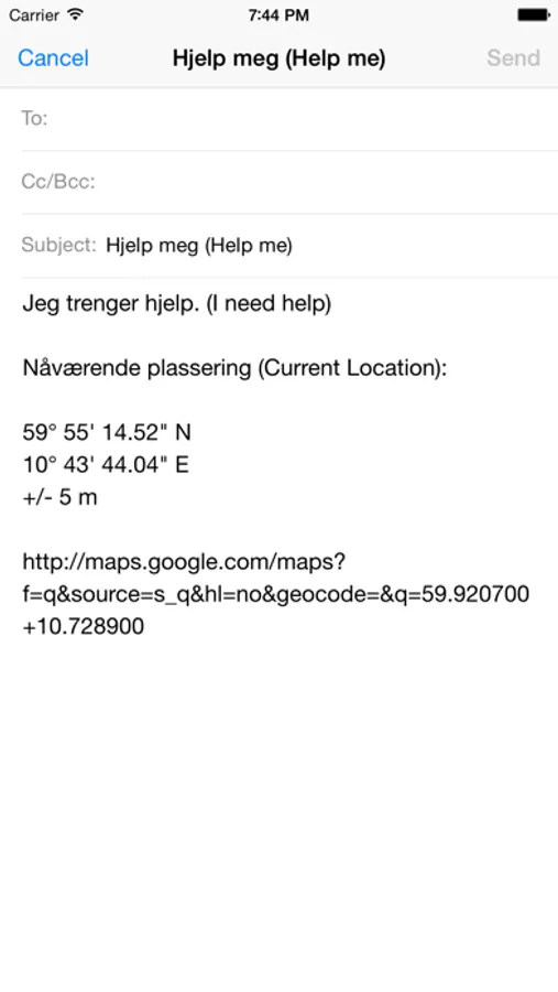 • Send SMS or e-mail to a friend or contact person with prefilled text in your language, including your GPS position and a html link to google maps.