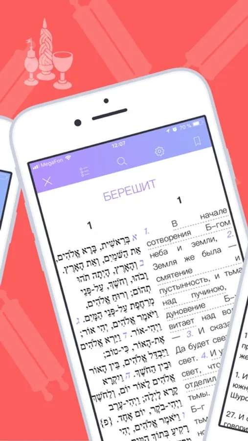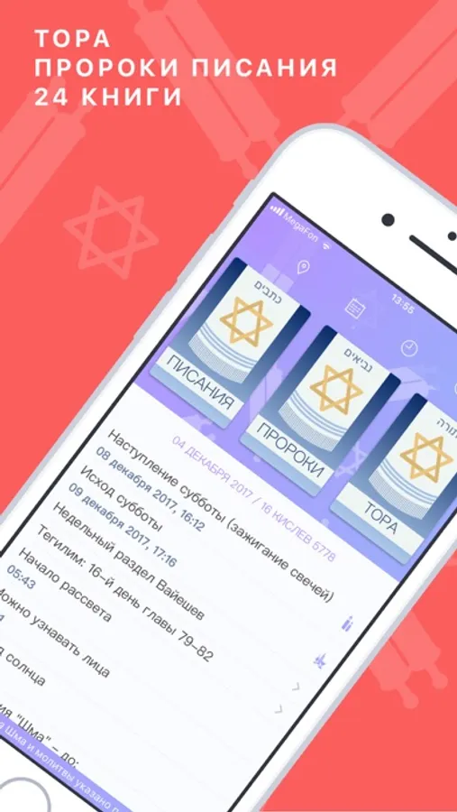 Текст Торы (Хумаш, Пятикнижие Моисеево) с классическим комментарием раби Шломо Ицхаки (РАШИ), книги Невиим (Пророки) и Ктувим (Писания) в переводе на русский язык. Возможность оставлять закладки и собственные комментарии. Еврейский календарь с автоматическим определением текущей недельной главы и основных астрономических времен (восхода и захода солнца, начала и окончания чтения Шма и молитвы) по местонахождению пользователя. Приложение создано организацией Тора миЦион и сайтом Толдот. ру и распространяется бесплатно. Текст Торы взят с разрешения «Мосад аРав Кук», перевод комментариев РАШИ — Фримы Гурфинкель. Мы ждем ваших отзывов и предложений на info@toldot. ru с пометкой «Приложение ТАНАХ» для реализации в новых версиях.