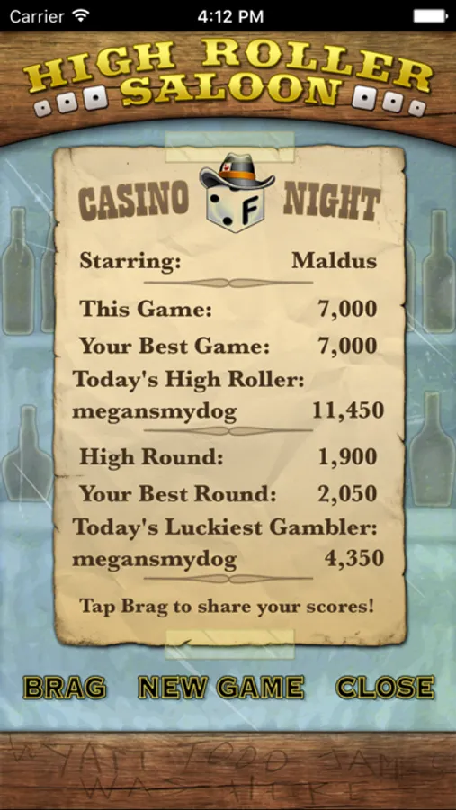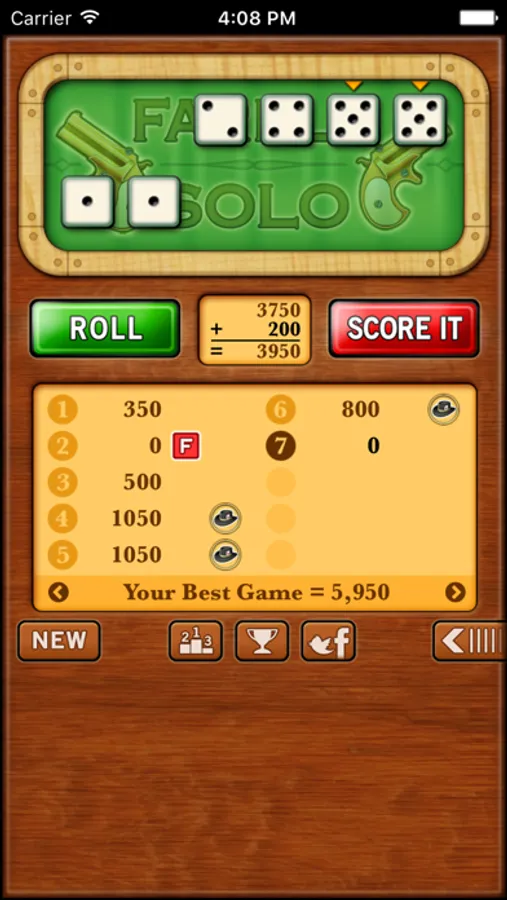 Solitaire version of Farkle. An exciting single player dice game. Score the most points in ten rounds to be the star of the High Roller Saloon. A single games is under five minutes, perfect for a quick game break. While playing, try to beat your best score or your friends. Are you ready to risk it all to beat the best?