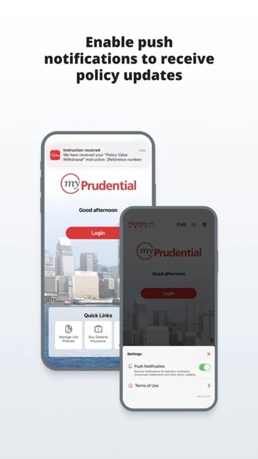 Download myPrudential now to stay updated on the latest insurance news and manage your policies effortlessly - so you can enjoy the health and wealth benefits brought to you by Prudential with complete peace of mind!