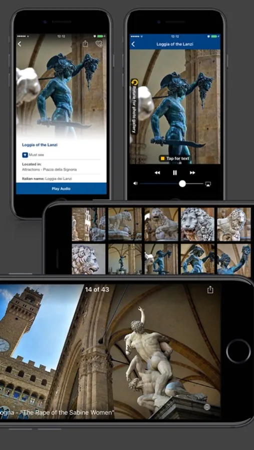 Beautiful maps each featuring several POIs with audio tracks that will let you discover the many not-to-be-missed sites of Florence as well as legends of the city.
