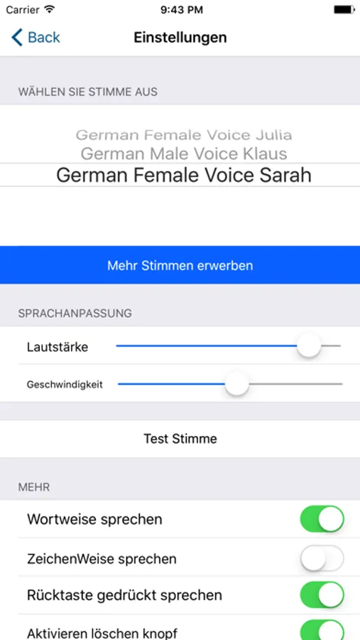 Regelbare Lautstärke und Geschwindigkeit für die Stimmen