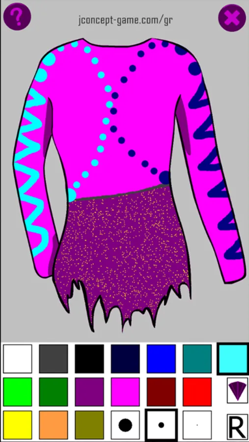 - 8 types de maillots, une palette de 16 couleurs, quelques tailles de pinceaux (dessiner doucement pour faire une ligne et rapidement pour dessiner les points façons paillettes) et un bouton V permettant de cacher la palette de couleur et afficher un des 3 arrières-plans.
