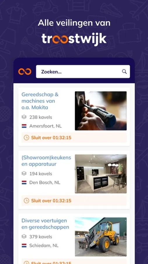 De Troostwijk Veilingen App geeft u de mogelijkheid om altijd en overal mee te bieden op een van onze actuele veilingen. Zowel het bedrijfsleven als particulieren kunnen bieden bij Troostwijk Veilingen.