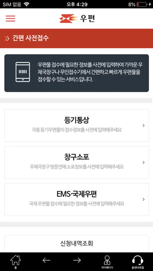소포, EMS·국제우편, 우표·엽서·카드, 부가우편서비스 이용내역 조회 서비스를 제공합니다.