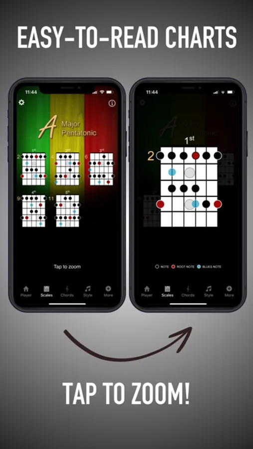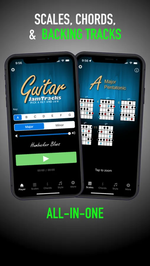 Learn guitar scales FAST with the #1 practice buddy and scale trainer on the App Store, Guitar Jam Tracks by Ninebuzz.