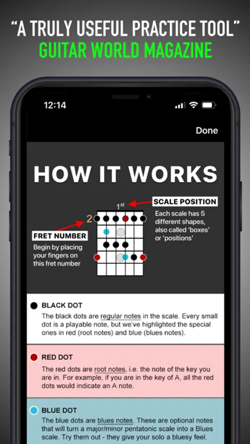 “This app is amazing! I'm now knee deep in scales practice and this makes learning scales and scale patterns so much more fun. I'm an intermediate player that has always gotten by with just "winging it" on solos and learning scales....this app has improved my playing and the motivation to practice each day. You won't be disappointed as the price is less than another book of scales and theory.” MusicmanJoe10, March 9, 2016