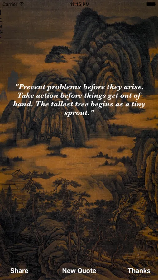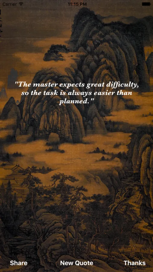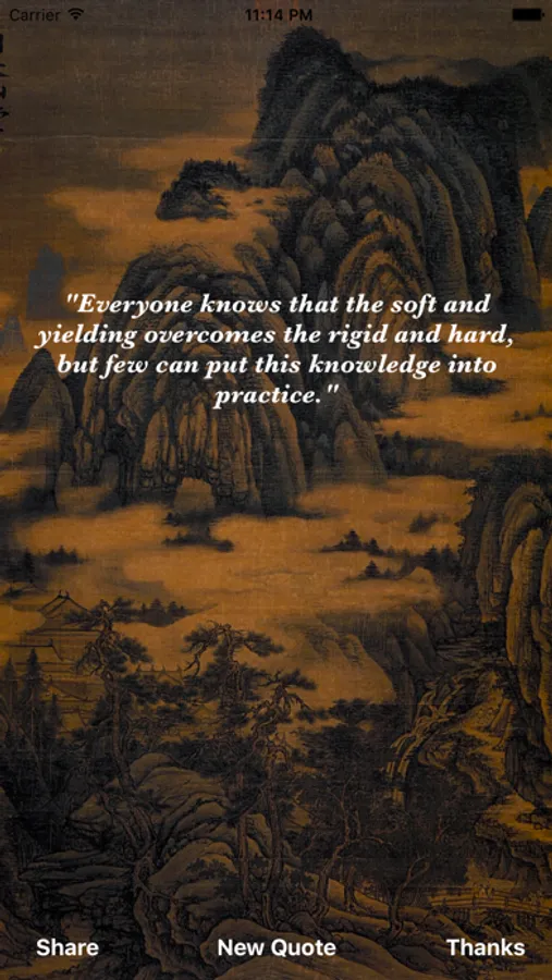 Taoist Wisdom gives you randomly chosen sayings of Lao Tzu from the Tao Te Ching. Taoist Wisdom is easy to use and doesn't require a network connection for getting new quotes. You can post inspiring quotes on social medial with the touch of a button.