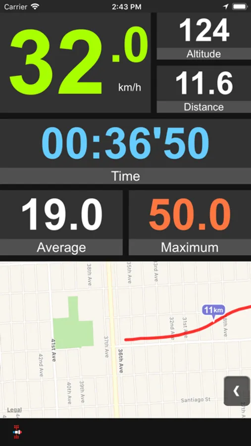 Displays the speed, time and distance, tracks your ride on a map(Apple standard, hybrid, satellite or Google map) with optional distance markers.