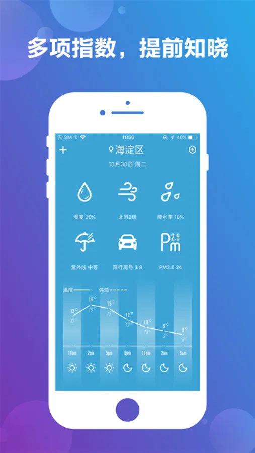 5. 贴心生活细节指数,显示当前空气湿度、风向风速