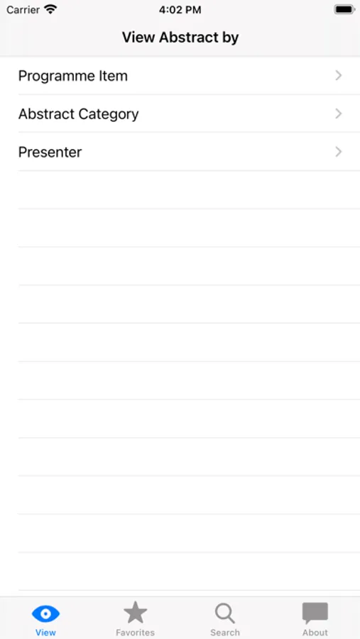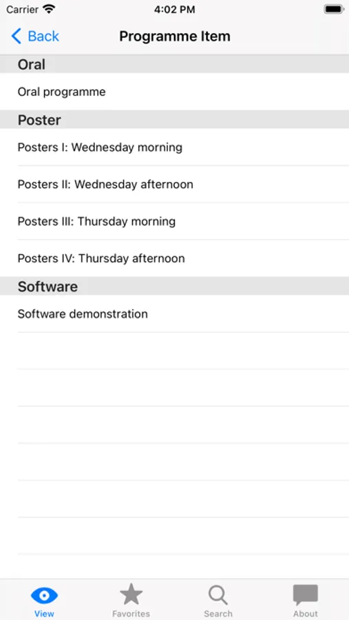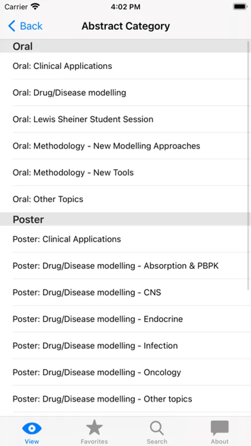 Abstracts can be sorted according to Programme Item (e.g. Oral Programme, Poster sessions, Software demonstrations), Abstract Category (e.g. Posters on CNS), or Presenter. Favourite abstracts are stored by clicking the star in the upper right corner when viewing the abstract.