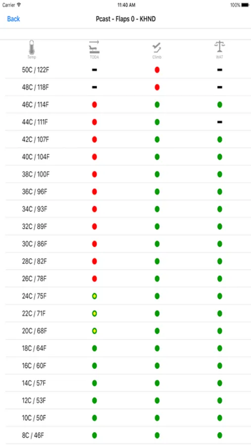 Performance Forecasting: PCast, for short, allows the user to quickly view takeoff performance as a function of temperature. In an easy to read graphical format; T/O Distance, OEI Climb Gradient and Max WAT, are displayed in 2C degree increments, as green and red icons depicting meeting or not meeting, respectively, that particular segment or limitation. The weight, runway slope, winds (which can be zero'd out), barometric pressure and field elevation are all held constant. The user has full control over "what-if" parameters for forecasting departure times. A green icon, filled with yellow, represents a calculation that meets the limitation (i.e. runway length) but is within 500 of the limitation giving the user a quick safety margin representation. Touching any temperature row, shows the actual values (i.e. T/O Distance, Max Weight 2nd Segment) digitally for that temperature. Toggle the switch in the upper right corner and do the same type of calculations holding OAT constant and varies the Gross Weight.